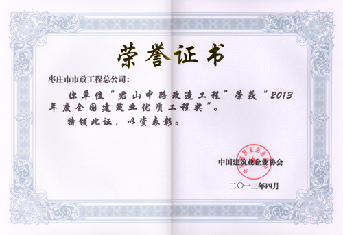 “君山中路改造工程”榮獲“2013年度全國建筑業(yè)優(yōu)質(zhì)工程獎”
