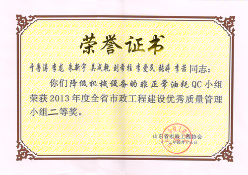 “降低機(jī)械設(shè)備的非正常油耗”QC小組榮獲2013年度全省市政工程建設(shè)優(yōu)秀質(zhì)量管理小組二等獎(jiǎng)