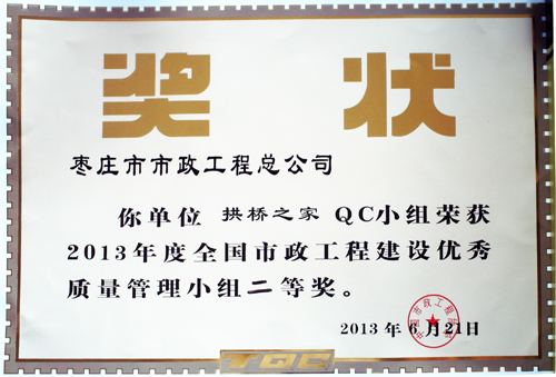 “拱橋之家”QC小組榮獲2013年度全國(guó)市政工程建設(shè)優(yōu)秀質(zhì)量管理小組二等獎(jiǎng)