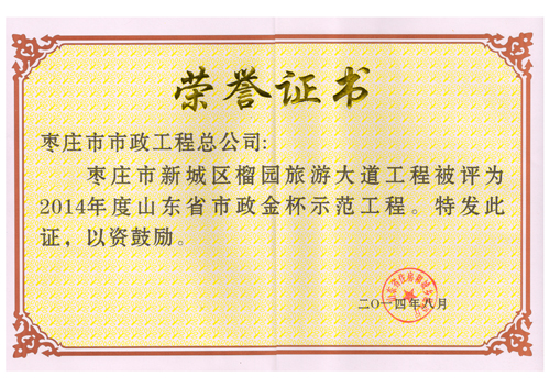 “棗莊市新城區(qū)榴園旅游大道工程”被評為2014年度全國市政金杯示范工程