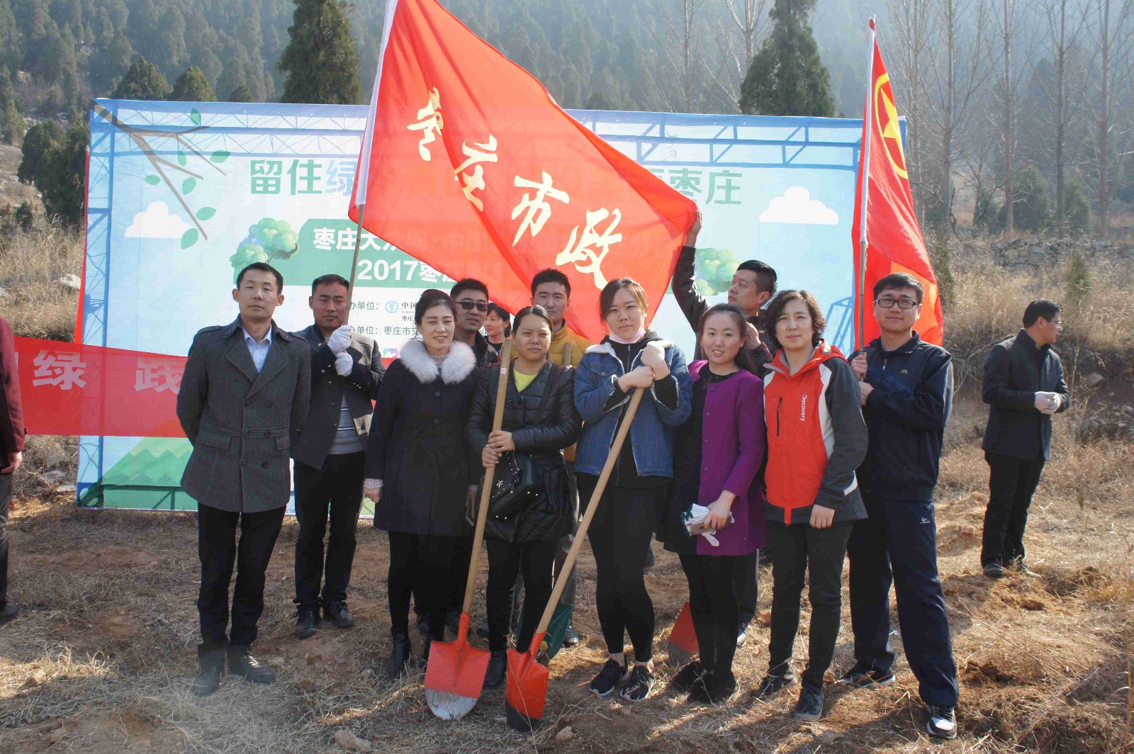 在市農(nóng)業(yè)局的專業(yè)技術(shù)人員的指導(dǎo)下,參加植樹活動的同志們,自覺分工、各司其職,大家挖坑、扶苗、填土、澆水……忙的不亦樂乎。盡管天氣有些冷,但是大家的熱情更加高,許多人額頭上都掛著汗珠,但當(dāng)大家看著自己親手種下的小樹苗時(shí)便忘記了勞累。在活動最后,志愿者們在獵獵招展的棗莊市政大旗和共青團(tuán)團(tuán)旗下,一起與自己親手種下的樹苗合影留念。
