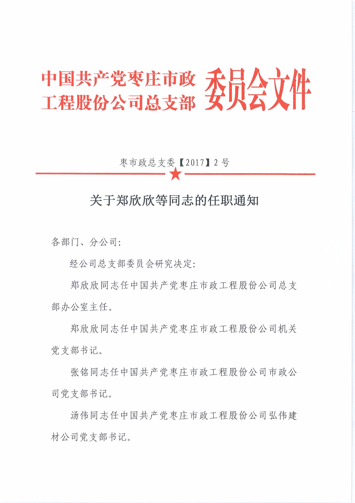 關(guān)于鄭欣欣等同志的任職通知